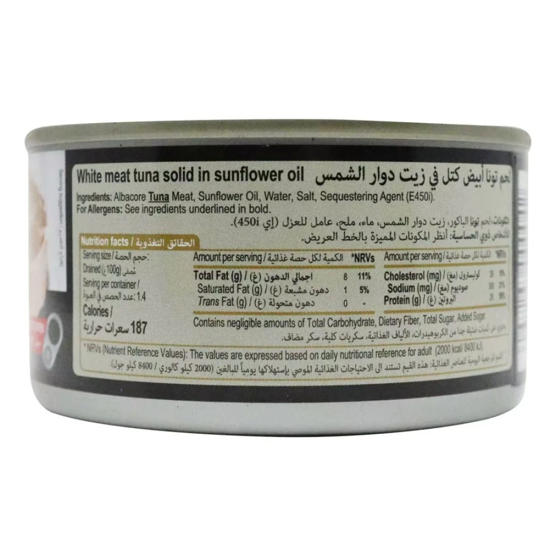 يعتبر لحم تونة الباكور الصلب في زيت دوار الشمس من كارفور خيار تونة معلبة لذيذة وصحية. يحتوي هذا المنتج على قطع من سمك التونة البكورة الصلبة المعبأة في زيت دوار الشمس مما يعزز نكهته وملمسه. يضيف زيت دوار الشمس طعمًا خفيفًا وممتعًا للتونة مما يجعلها مثالية للإستمتاع بها بمفردها أو إضافتها إلى السلطات والسندويشات وأطباق المعكرونة. تحتويكل علبة على 185 غرام من التونا عالية الجودة، يضمن هذا المنتج خيار وجبة مرضية ومغذية. يعد لحم تونة الباكور الصلب في زيت دوار الشمس من كارفور خيارًا رائعًا يجب مراعاته سواء كنت من محبي التونة أو تتطلع إلى دمج المزيد من البروتين في نظامك الغذائي.