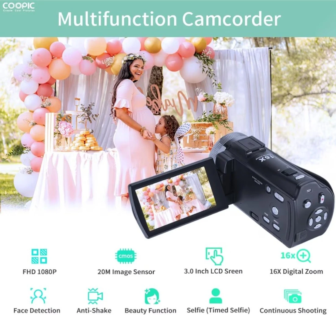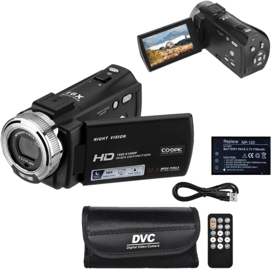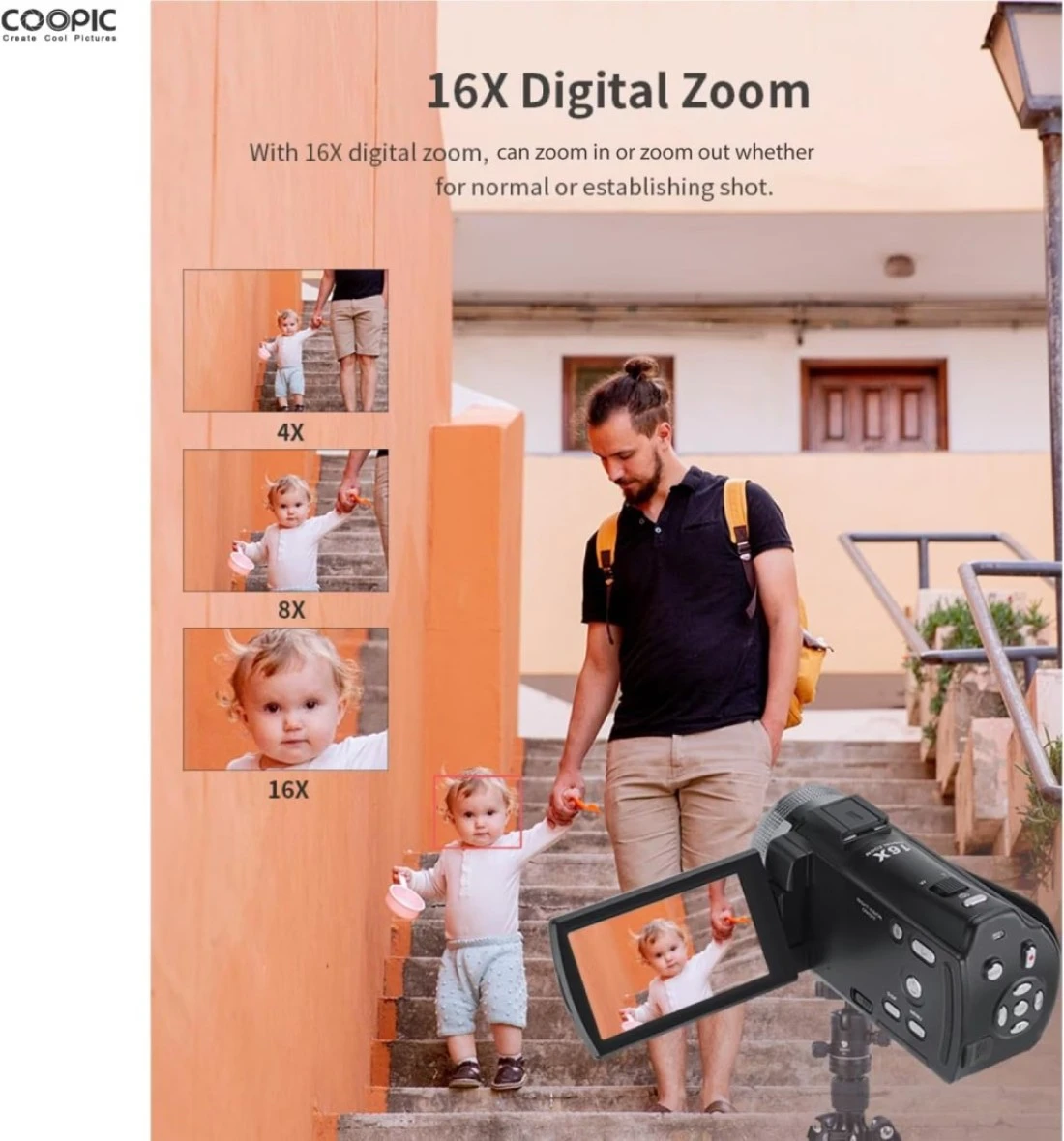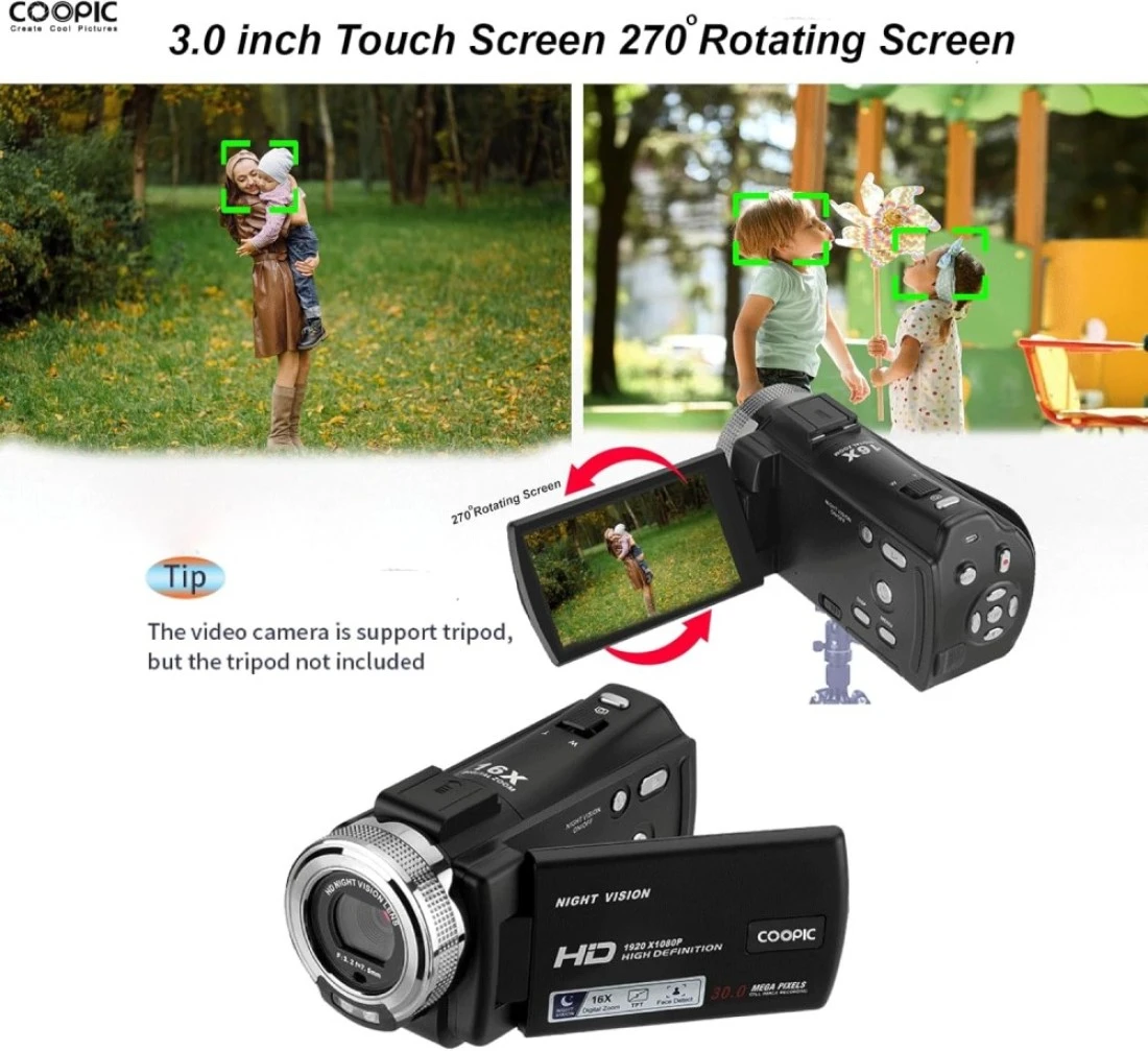 COOPIC V1000 3’’ TFT, Anti-Shake, 270° Screen Rotation, Full HD 1080P Digital Video Camera 30MP Photo, 16X Zoom, Night Vision, Compatible with Windows XP/7/8/10 for Photography and Videography