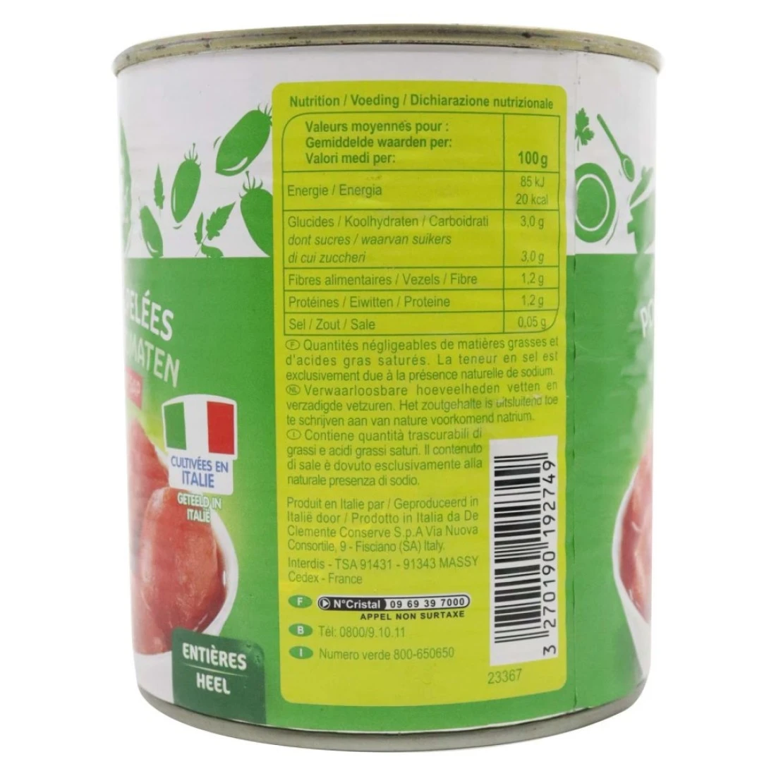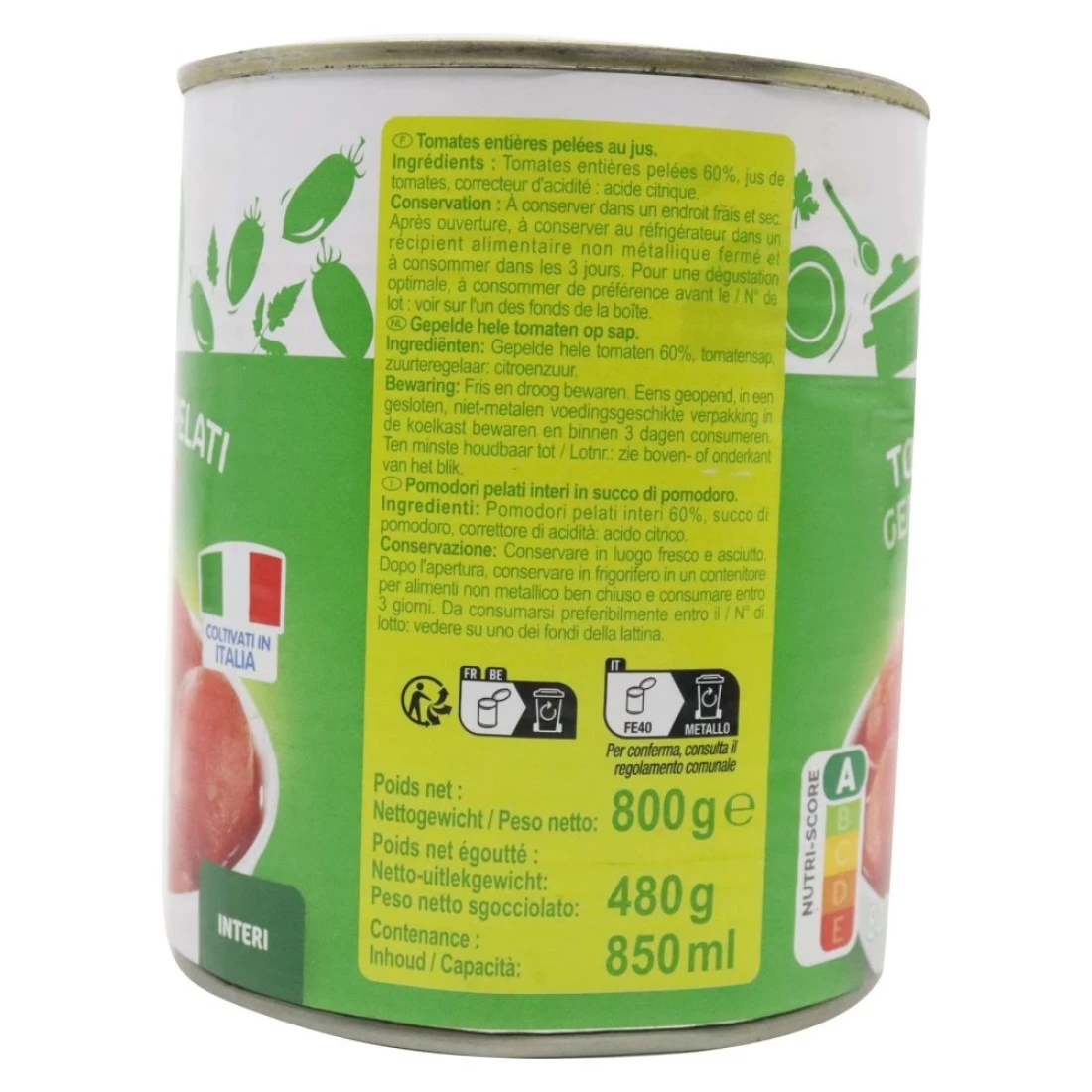 ingredients : طماطم كاملة مقشورة 60٪، عصير الطماطم، مثبت الحموضة: حمض الستريك