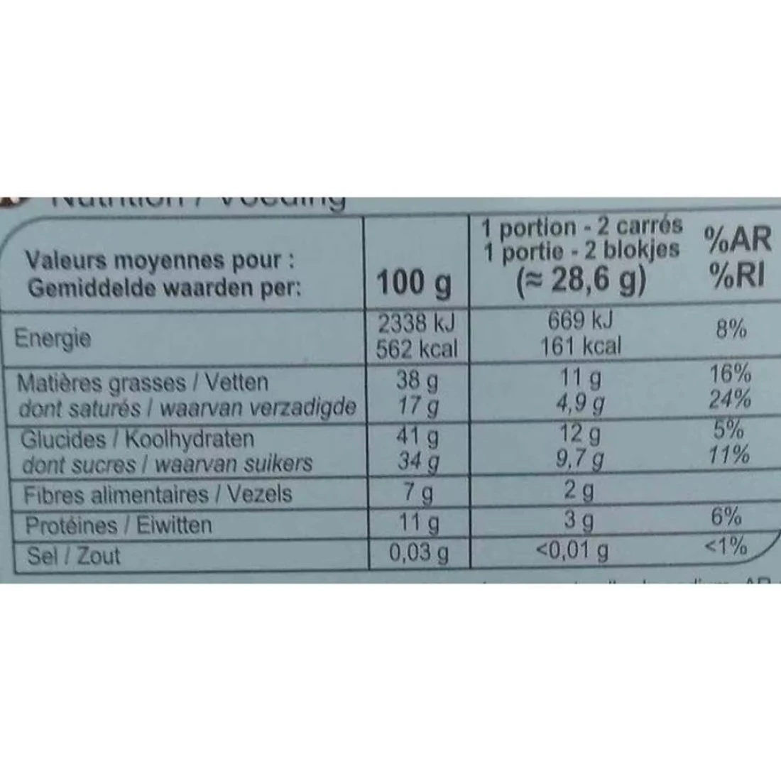 ingredients : معجون الكاكاو، سكر، لوز كامل محمص 25%، زبدة الكاكاو، مستحلب: ليسيثين (الصويا)، نكهة. الكاكاو: 55% كحد أدنى من الشوكولاته الداكنة. قد يحتوي على آثار الحليب والمكسرات الأخرى.
