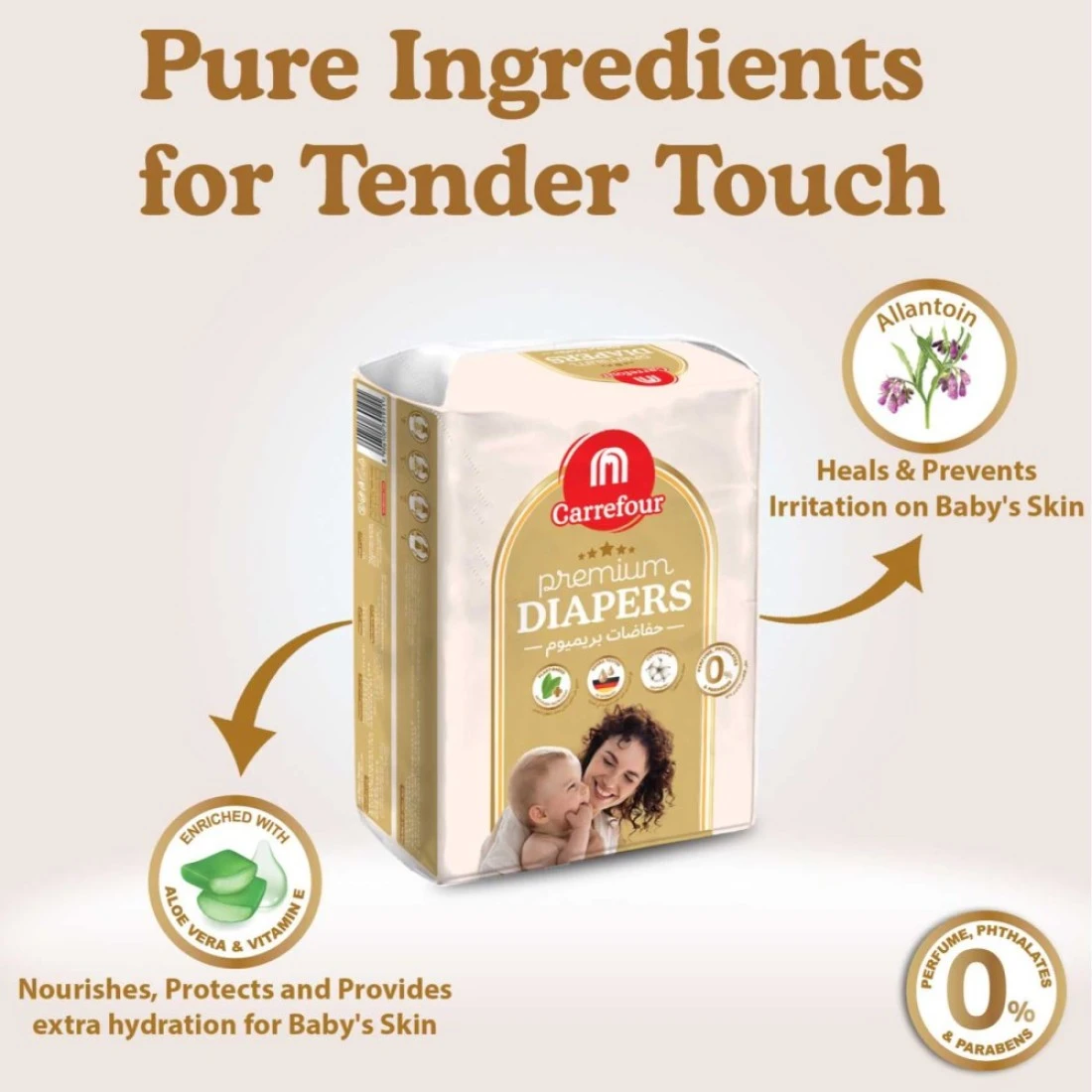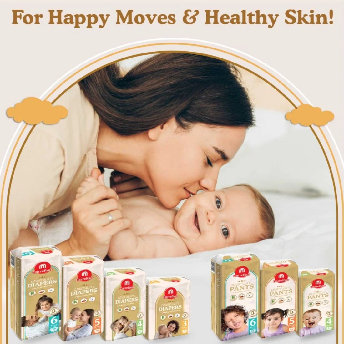 تم تصميم حفاضات كارفور بريميوم لتوفير الراحة والحماية الإستثنائية لطفلك. مصنوعة من مواد ناعمة وجيدة التهوية، تضمن هذه الحفاضات ملاءمة مريحة مع السماح بأقصى قدر من الحركة. تتميز بتقنية إمتصاص متقدمة تحبس الرطوبة وتمنع التسرب، مما يحافظ على طفلك جافًا ومريحًا طوال اليوم والليل. يقلل التصميم المضاد للحساسية من خطر التهيج، مما يجعلها مناسبة للبشرة الحساسة. مع توفر أحجام مختلفة، تلبي حفاضات كارفور بريميوم إحتياجات الأطفال في مرحلة النمو، مما يوفر للآباء راحة البال والراحة.
