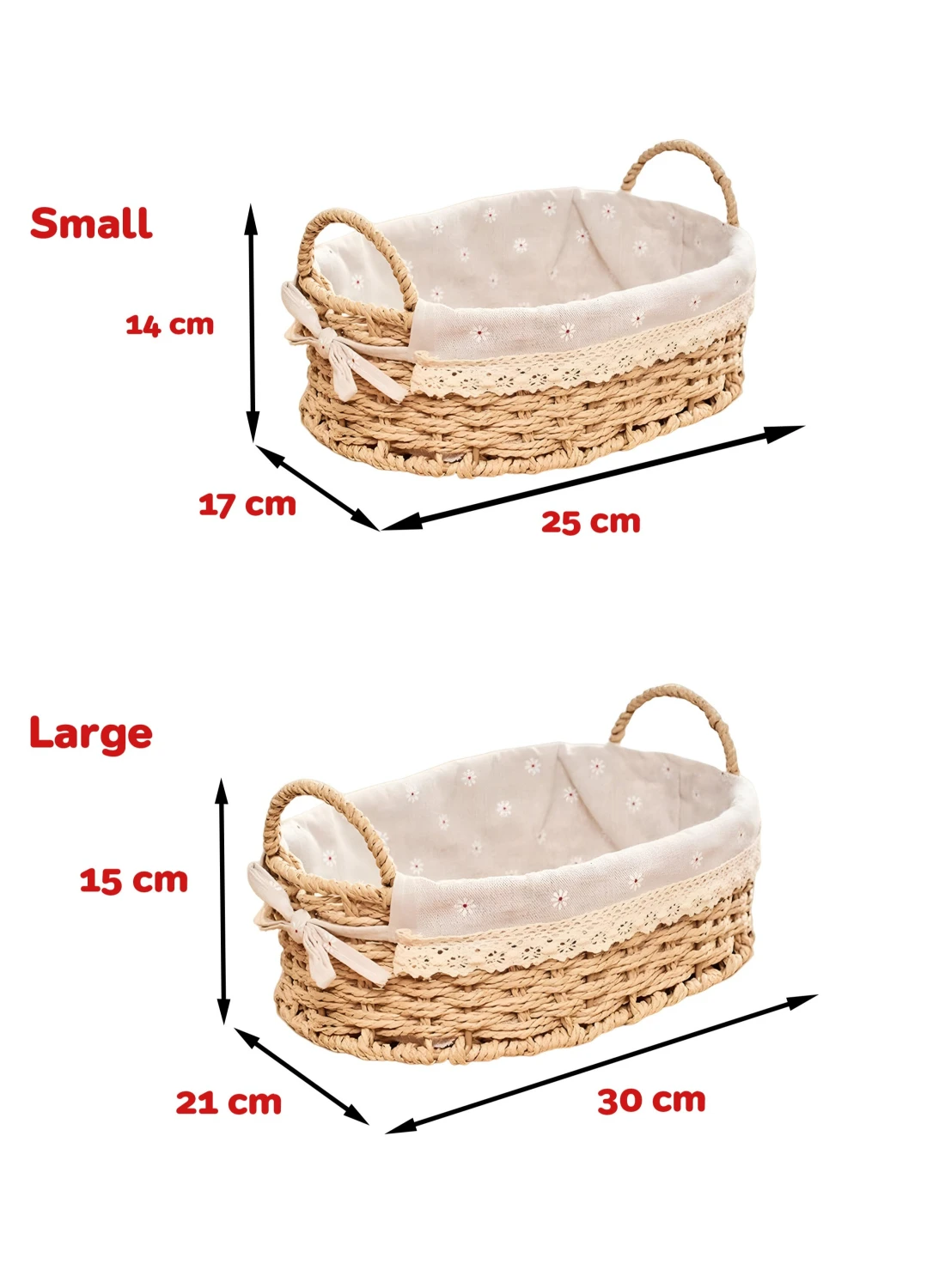 - Set of 2 Sizes: Large (30 x 21 x 15 cm), Small (25 x 17 x 14 cm).