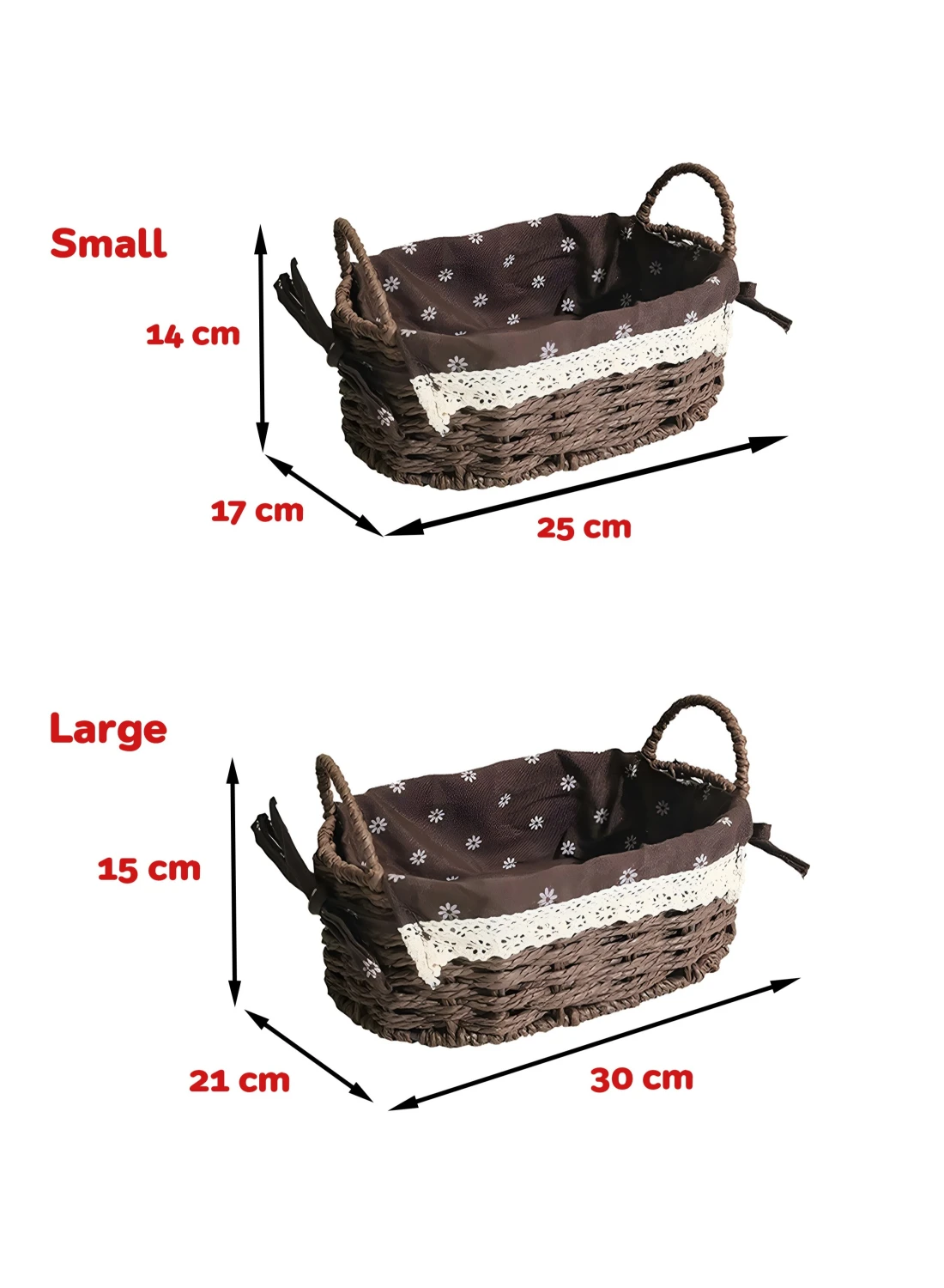 - Set of 2 Sizes: Large (30 x 21 x 15 cm), Small (25 x 17 x 14 cm).