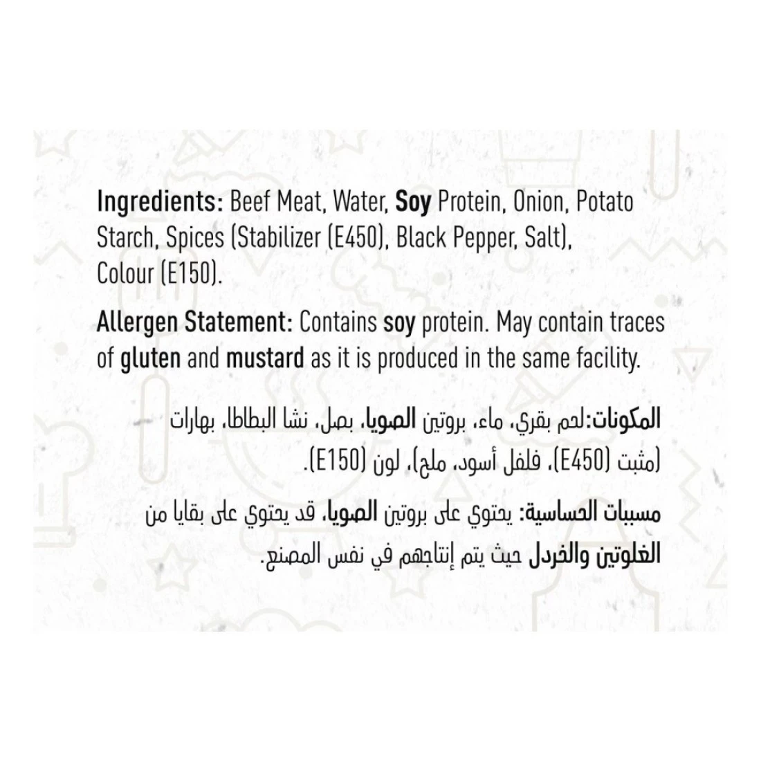 ingredients : Beef Meat, Water, Soy Protein, Onion, Potato Starch, Spices (Stabilizer (E450), Black Pepper, Salt), Colour (E150)