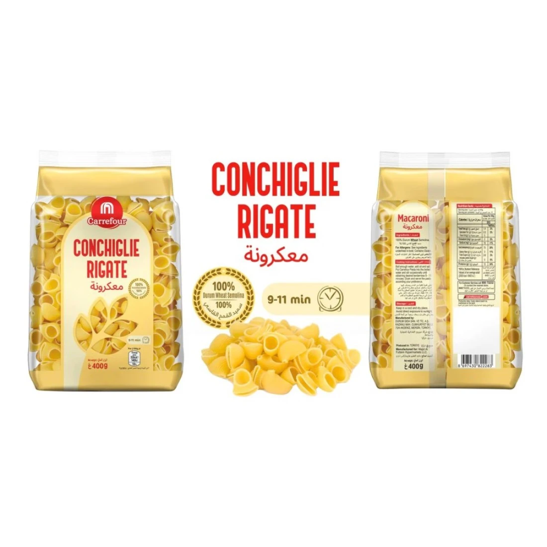 - Enjoy the popular and beloved shape of conchiglie rigate pasta by Carrefour with delicious red sauce or creamy white sauce