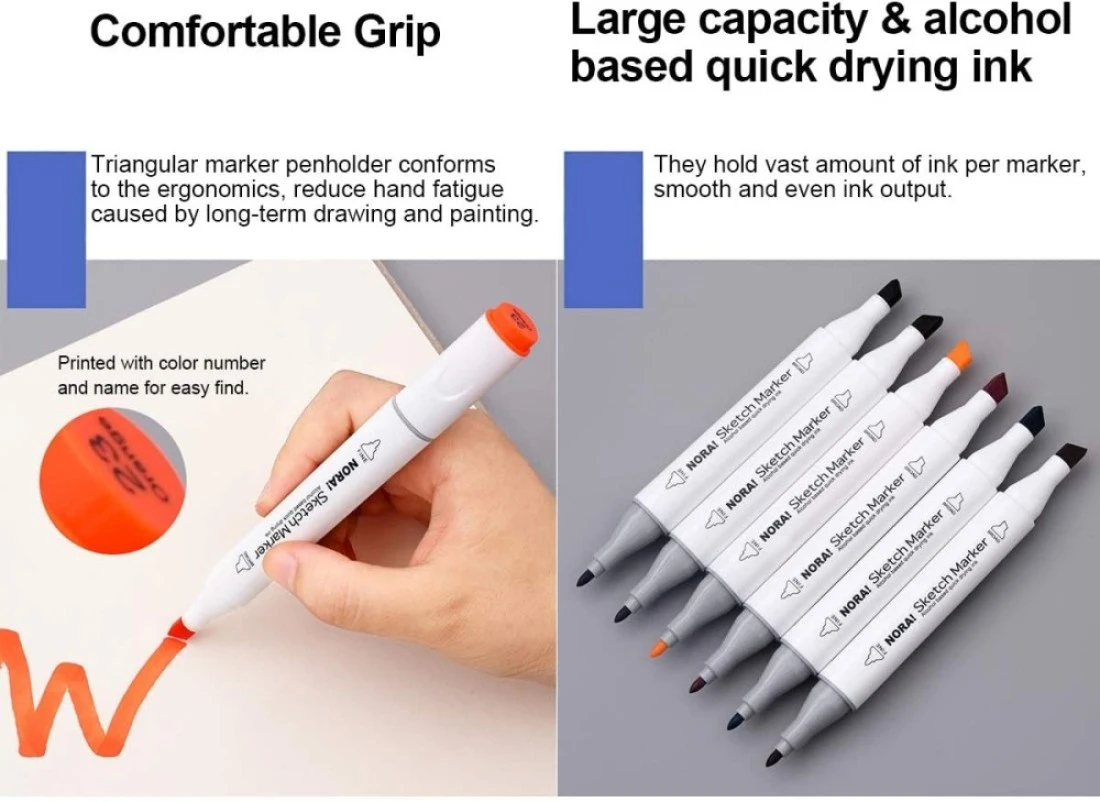 Comfortable Grip : Comfortable grip of the triangular marker pen conforms to the ergonomics, reduce hand fatigue caused by long-term drawing and painting. The caps of marker pen are printed with color number and color name for easy find.