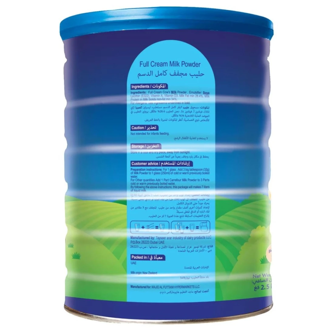 Carrefour Full Cream Milk Powder is a high-quality milk powder that is made from pure and natural cow's milk. It is rich in nutrients including vitamins and minerals making it an ideal choice for a healthy and balanced diet. This 2.5kg pack is perfect for households or individuals who consume milk regularly and prefer the convenience of a powdered form. It can be used to make delicious milk drinks and desserts or added to your favourite recipes. Carrefour Full Cream Milk Powder is a trusted brand known for its superior taste and nutritional value.