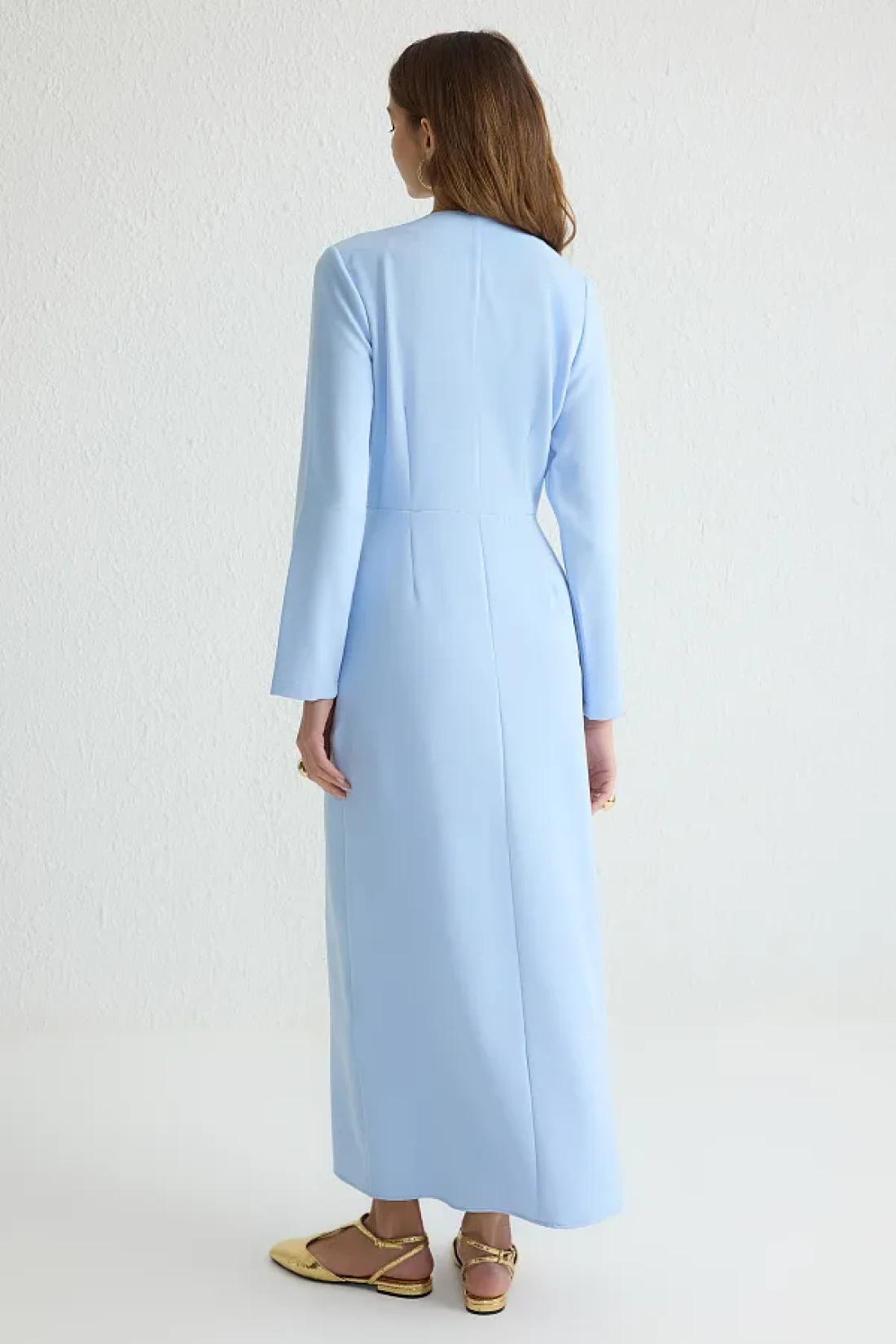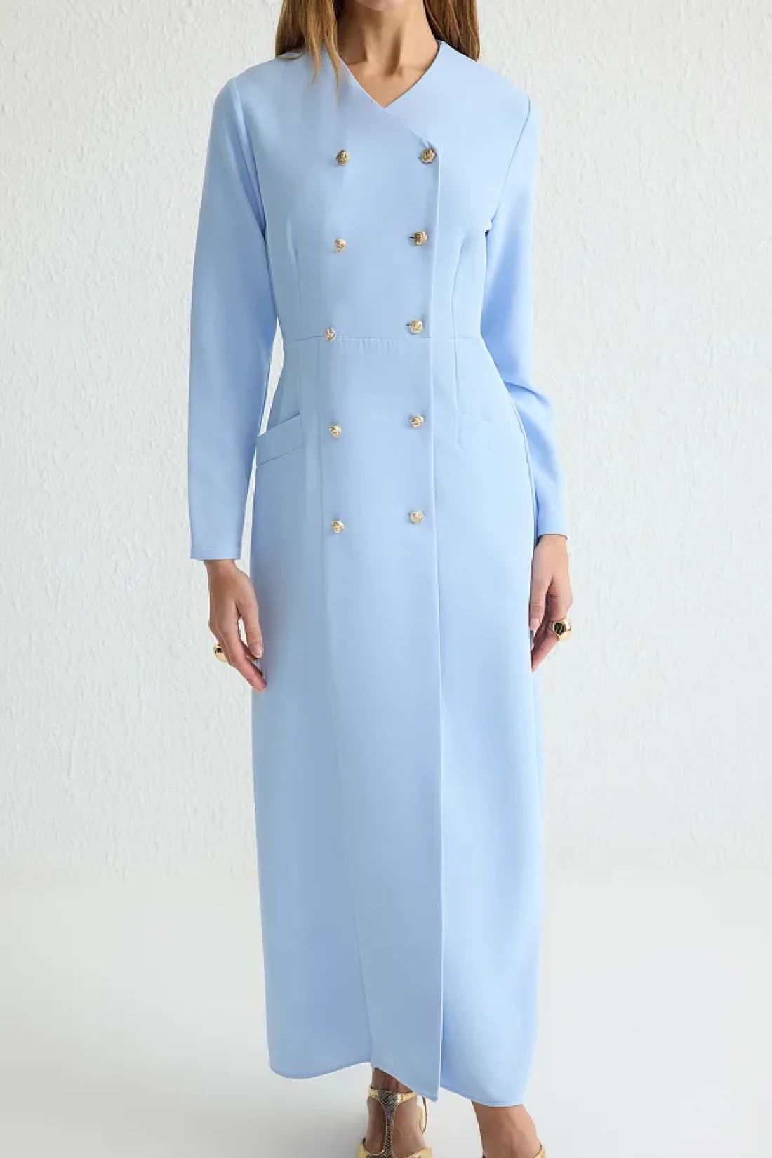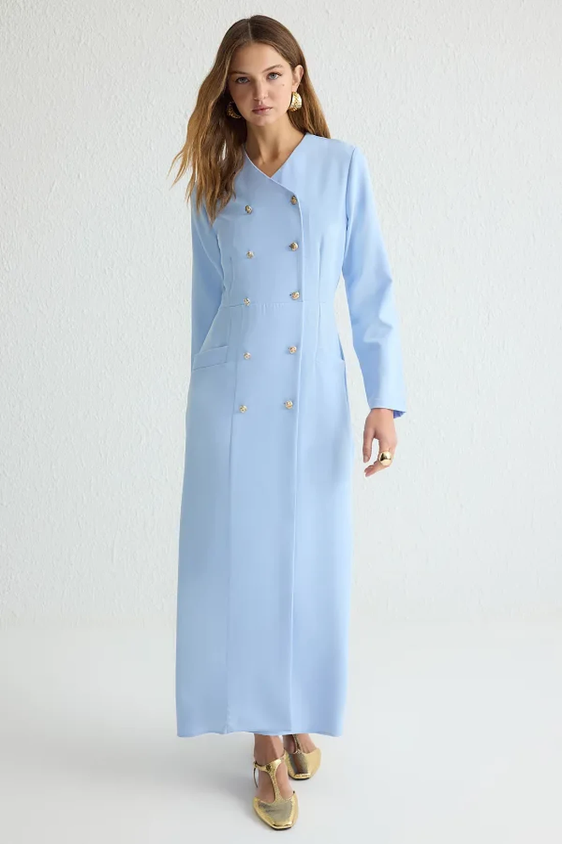 Modest Blue Button Woven Fabric Dress Tctss25Eb00027